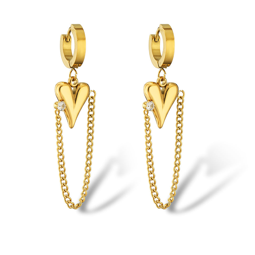 Aritos de corazón con colguije de cadena, acero titanio con baño de oro 18K