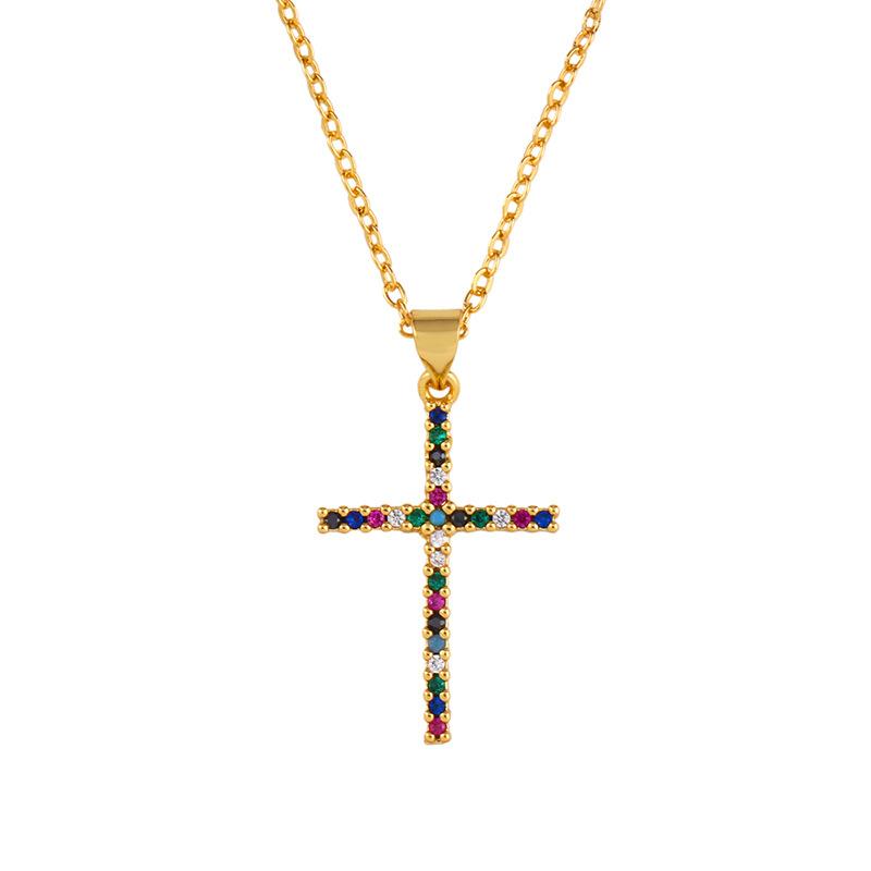 Cadena con dije de cruz, laminado en oro con incrustaciones de zirconia