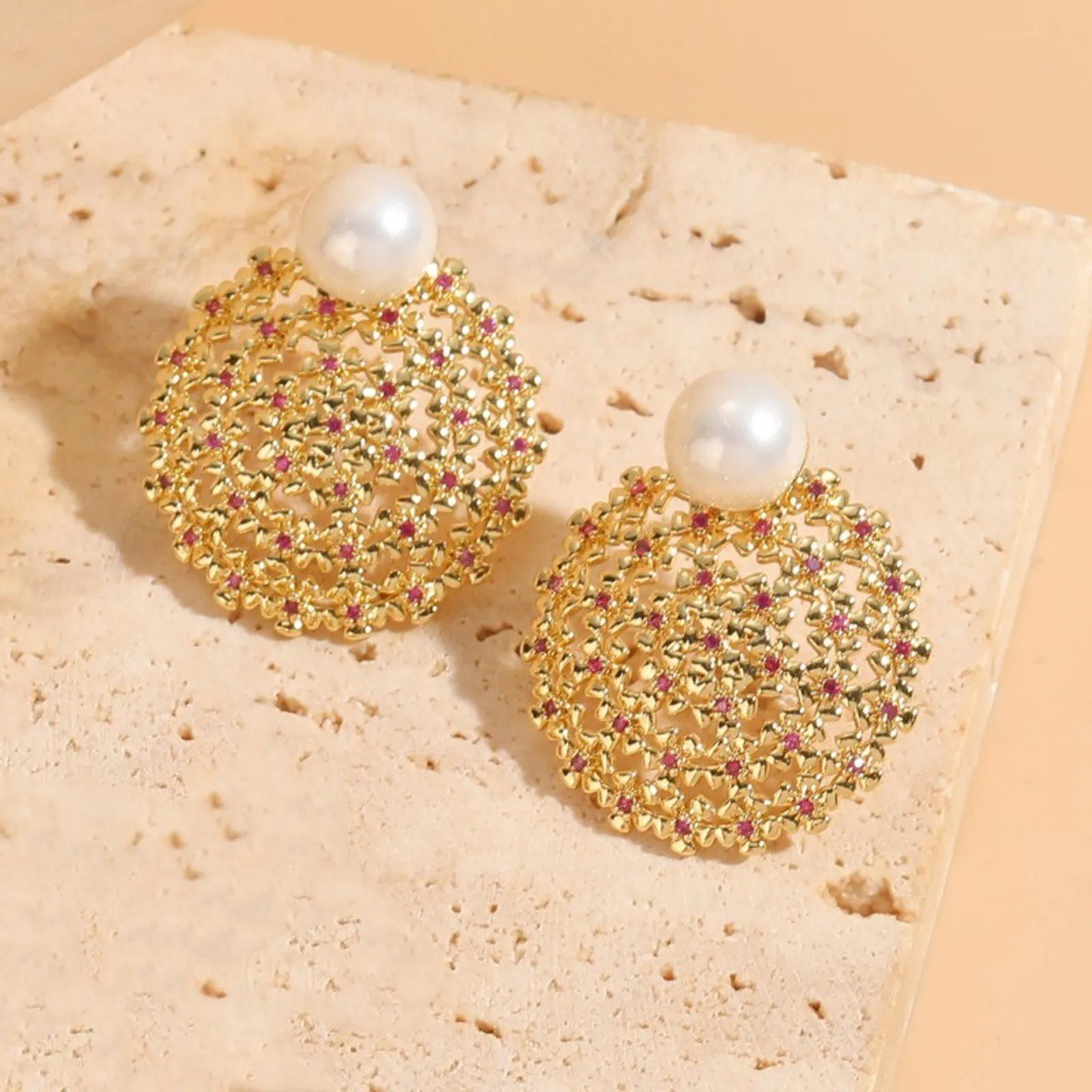 Aritos con perlas artificiales, incrustaciones de zirconia, baño de oro de 14K