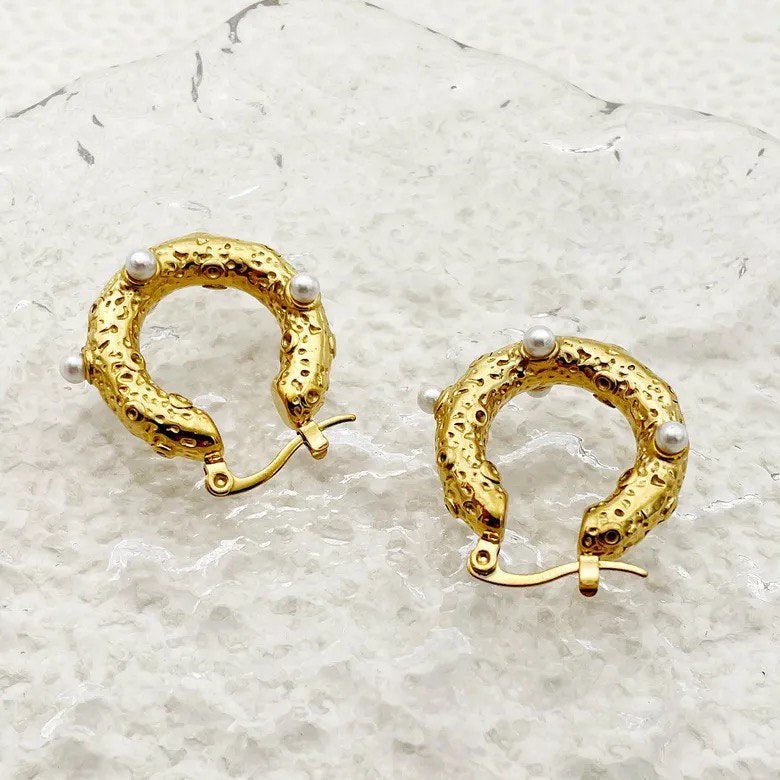 Aritos, laminado de oro con pequeñas incrustaciones de perla artificial.