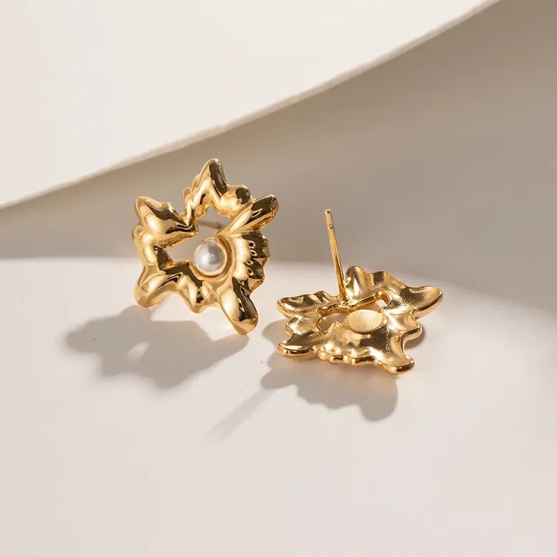 Aritos, con perla artificial, acero inoxidable con baño de oro 18K.