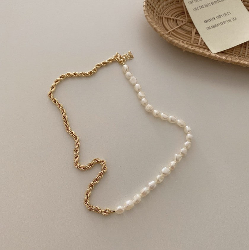 Cadena choker, mitad cadena mitad perla natural, laminado en oro
