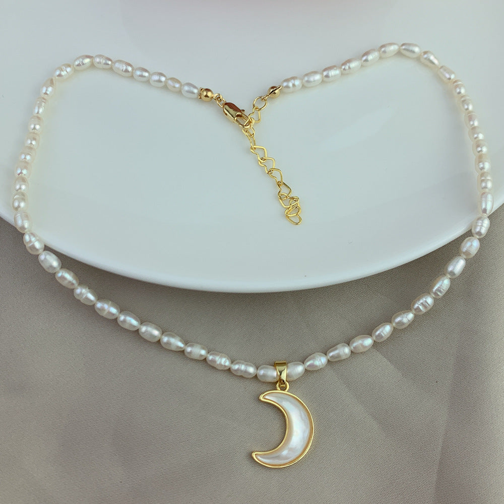 Cadena choker, con perla artificial y dije de luna de piedra nácar