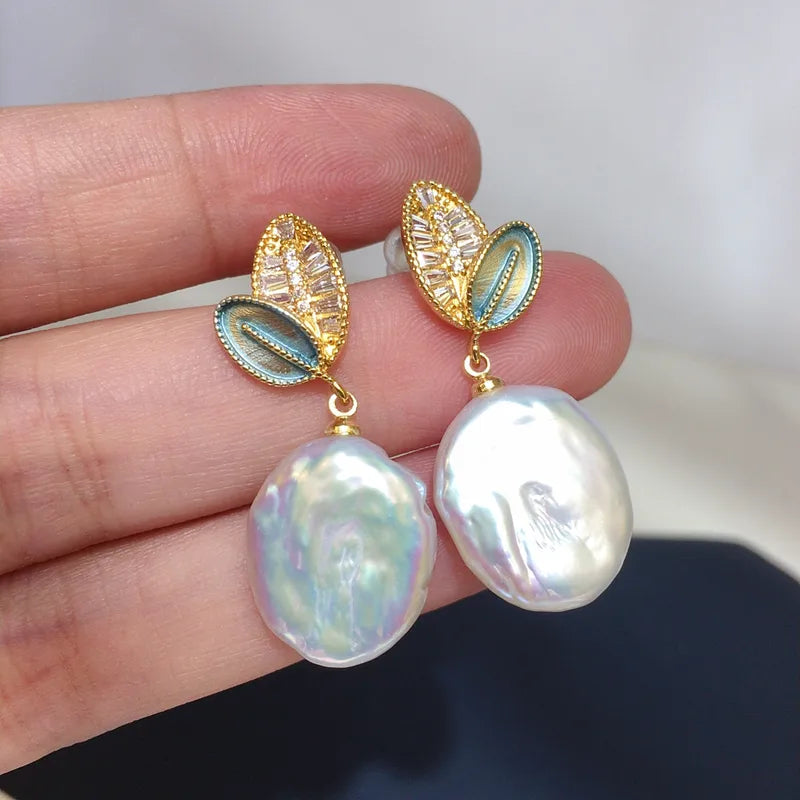 Aritos , stud, laminado en oro, en forma de hoja con perla